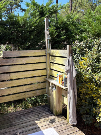 Dans le domaine naturiste unique « La Jenny », sur la côte atlantique française, vous attend notre chalet privé – niché dans la pinède, légèrement surélevé avec une large vue sur le golf et à seulement quelques minutes de la plage.